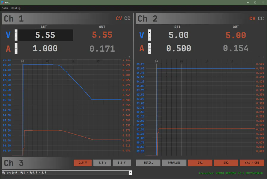 KoRC - free software for controlling the Korad KD3305P power supply from a computer with Windows 7/8/10/11.It can be used as a replacement for software provided by the manufacturer, which requires the installation of the Labview environment to work.